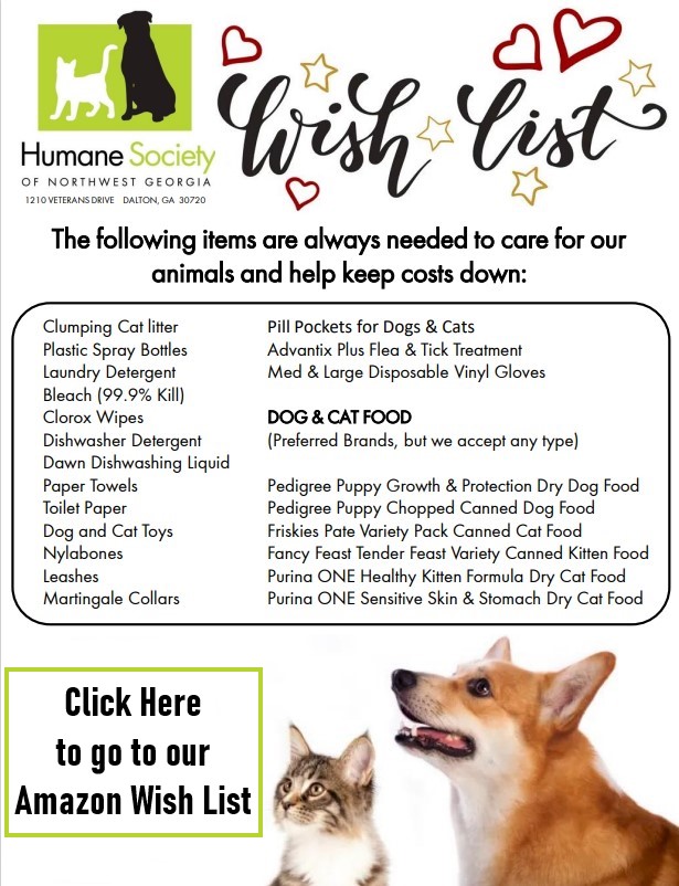 The Humane Society of Northwest Georgia is a non-profit organization funded only by the generosity of your donations and adoption fees. We work every day to find homes for our dogs and cats. Your gift provides these animals with a nutritional diet, bedding, medical care, and more while they stay here at the shelter.